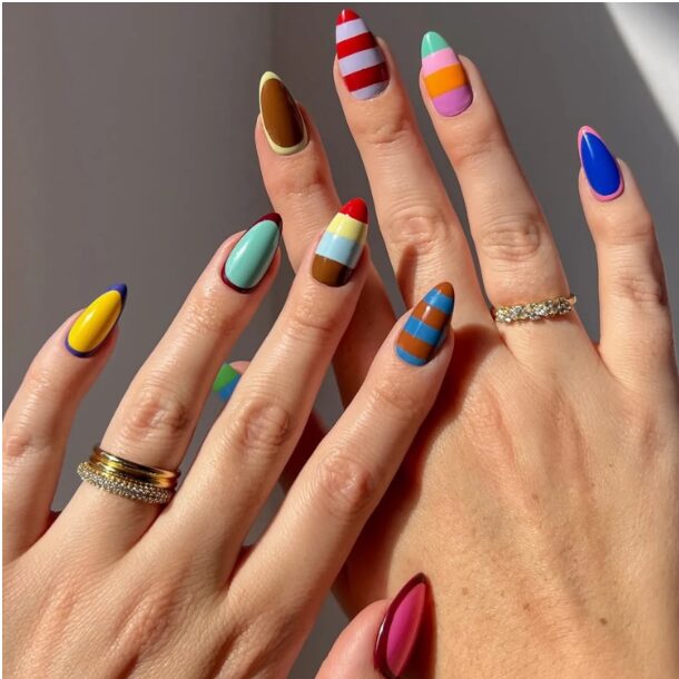 Overlapping stripes of varying widths create an illusion of depth, turning your nails into an art canvas.