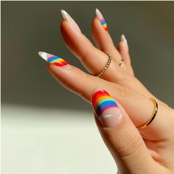 White stripes extend diagonally from the tips, blending classic French style with a fresh twist. - Mixed Thick and Thin Stripes